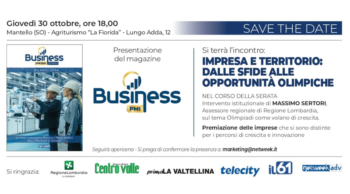 Un evento che nasce per valorizzare le eccellenze locali e affrontare i temi più attuali legati alla crescita e alla sostenibilità delle PMI, in un momento storico in cui le Olimpiadi Invernali 2026 rappresentano una grande opportunità di sviluppo per la Valtellina e per l’intera Lombardia.